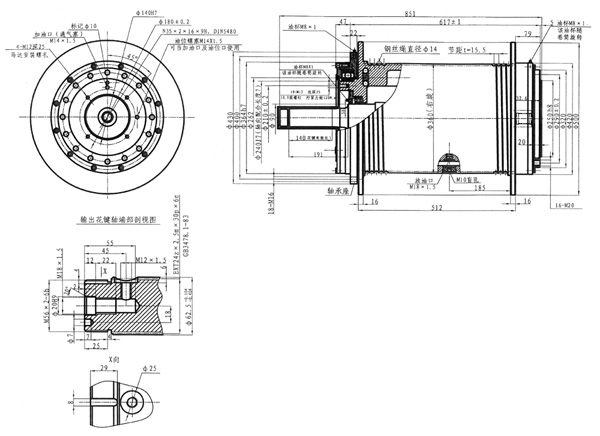 | 面上的18-M12-6H螺孔将制动毂安装和紧固在卷筒的输出端,并通过渐开线花键副 |